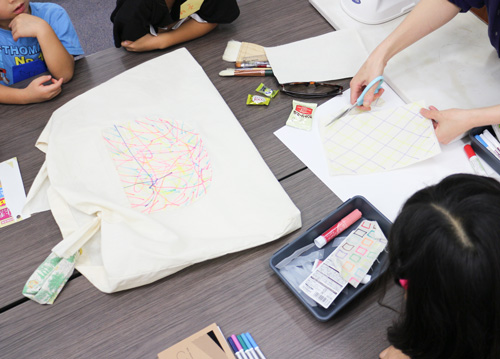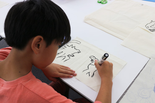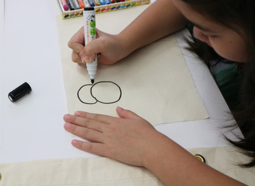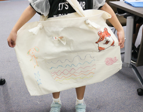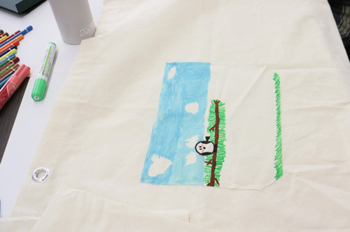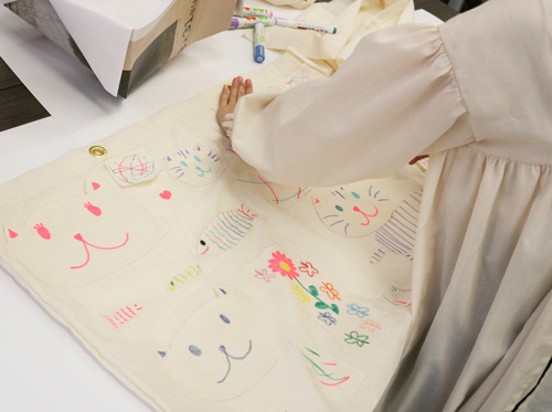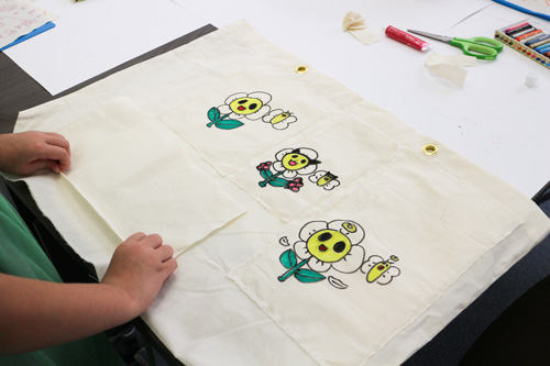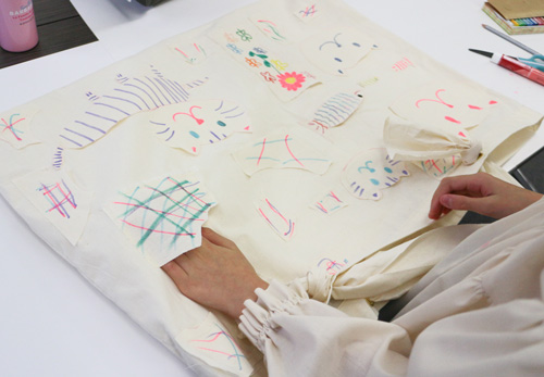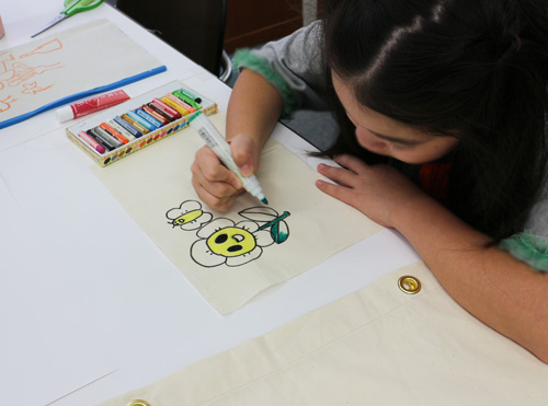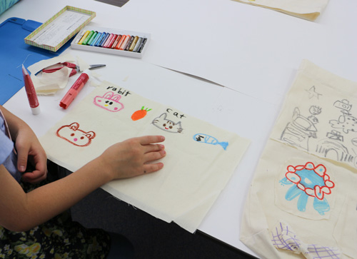 綿の生地に布用クレヨンやペンを使って絵を描き、