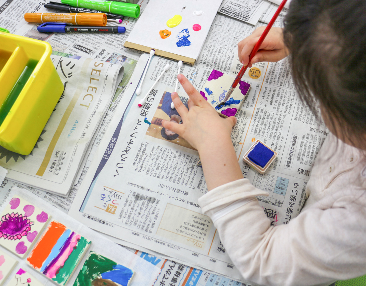 小さな木のタイルに、ペンや絵の具で絵を描いたり、